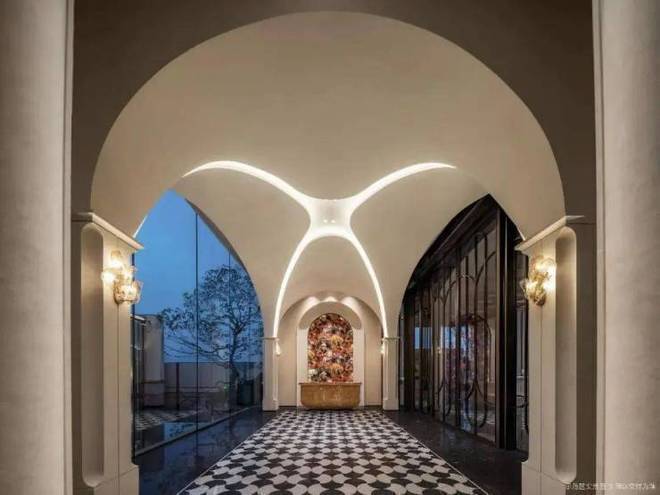 社区游廊内,提取了扬子饭店的弧形门厅形制为灵感设计,具有现代气息又不失人文意境,并多处运用了取材自然的奢石元素、玉兰造型的壁灯等,打造自然艺术感。