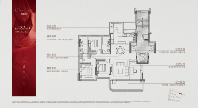 建面约132㎡3+x房设计,整个户型格局,大开间短进深、南北通透、动静分离。超大会客空间可分可合,可以自由改造,做大横厅三房或者四房都可以,可塑性很强。