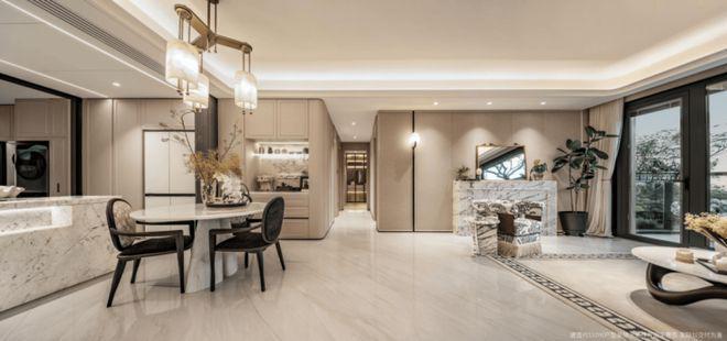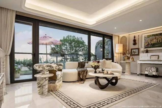 约3.1米的层高,地面采用了90*180的地砖通铺,外加超大的落地窗,视觉效果拉满。